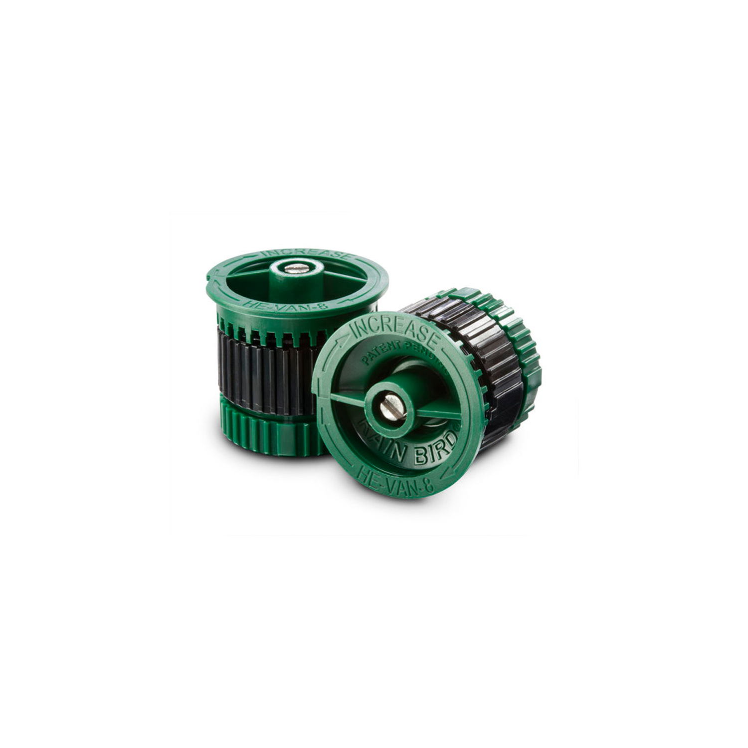 Una boquilla variable y de alta eficiencia! Con un ajuste de 0˚ a 360˚, podrá regar con eficacia terrenos de todas las formas, además de ahorrar tiempo y dinero. Esta boquilla tiene un alcance entre 1,8 mts a 2,4 mts de diámetro dependiendo de la presión de agua. Las boquillas Rain Bird HE-VAN consiguen una uniformidad de distribución media superior al 70% — una mejora de más del 40% comparada con las boquillas de sector variable del mercado. – Fácil ajuste entre 0° a 360° con un simple giro del anillo central.– ExactEdge™ realiza el ajuste fuera de sector. Según gira la tobera al ajuste deseado, sentirá que se fija en su posición, de esta forma conseguira ajustes muy preciso con bordes bien delimitados.– La tecnología de control de caudal proporciona un riego superior en el corto alcance y una cobertura uniforme en todo el terreno a regar.– Chorros más gruesos y gotas más grandes para una mayor resistencia al viento.– Un resistente deflector superior minimiza los daños a la tobera debidos al desgaste y y minimiza también los riesgos de rotura.– Tornillo de ajuste de acero inoxidable para el ajuste del caudal y el sector. Reducción del alcance hasta un 25%– Compatible con todos los difusores Rain Bird® serie 1800®, difusores de la serie UNI-Spray™ y adaptadores para toberas de difusores Rain Bird