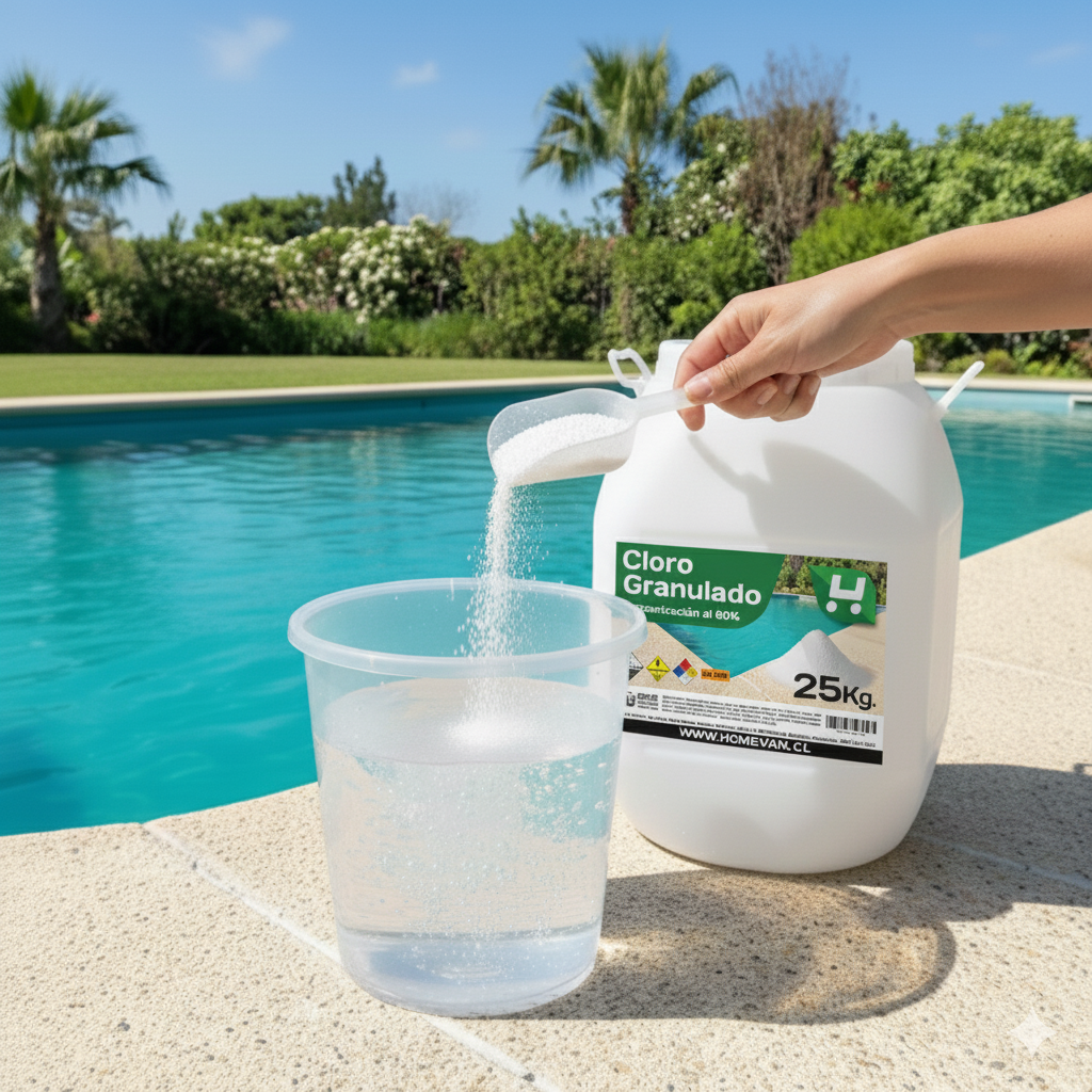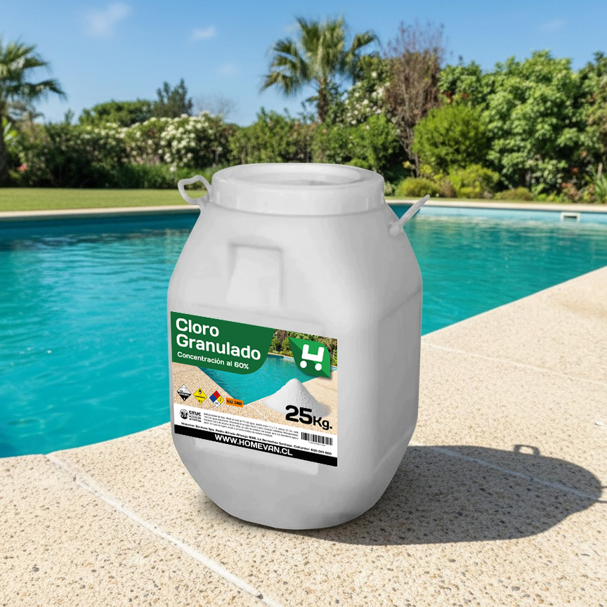 El Cloro Granulado 60% 25 kg Homevan es un desinfectante de alta eficiencia diseñado para mantener el agua cristalina, libre de bacterias, algas y microorganismos. Gracias a su alta concentración de cloro activo, permite una desinfección veloz y efectiva en piscinas residenciales y comerciales. Este producto es ampliamente utilizado en el mantenimiento de piscinas por su cómoda dosificación, rápida disolución y potente acción sanitizante.