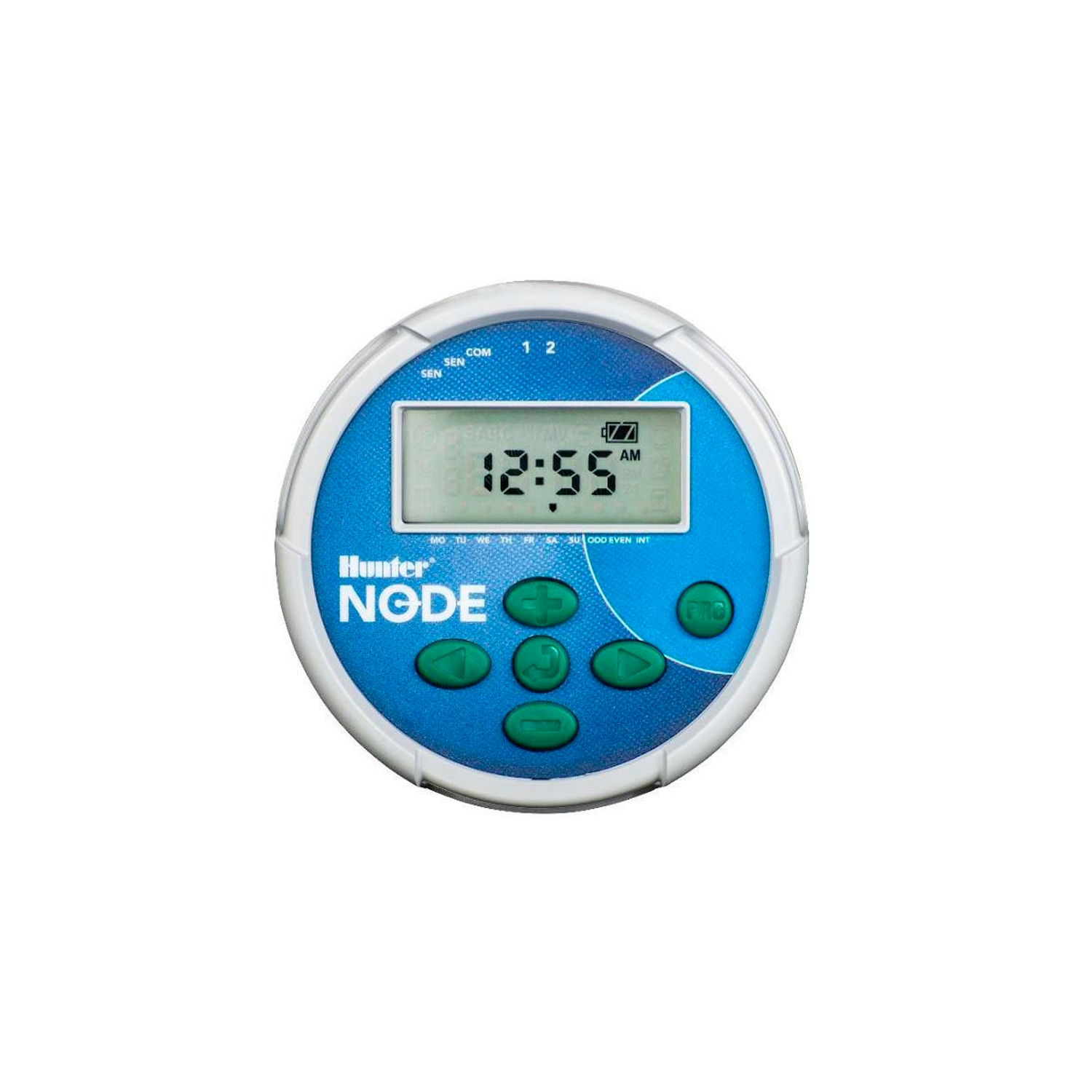 Node se alimenta con una o dos baterías de 9 V que le proporcionan energía mas que suficiente a lo largo de toda la estación. Además de una fiabilidad excepcional, el Node se caracteriza por una pantalla LCD de fácil programación, la posibilidad de controlar una válvula maestra y el uso del lenguaje de programación estándar de los programadores Hunter, con 3 programas y 4 horas de inicio por programa.