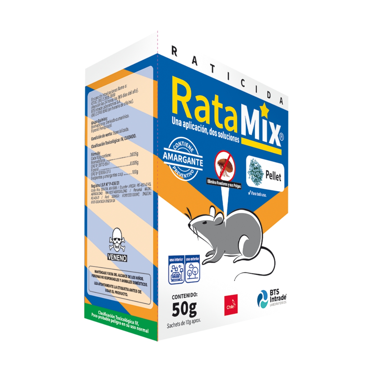 Único rodenticida en Chile que controla a los roedores y a los ectoparásitos presentes en ellos, como pulgas, garrapatas, piojos, entre otros. Gracias a su original formulación que posee un rodenticida (Bromadiolona) y un insecticida (Fipronil). Eliminando 2 vectores con una sola aplicación solucionando de manera eficiente estos problemas de Sanidad Ambiental. Formulado en pellet para lugares secos o en interiores.
