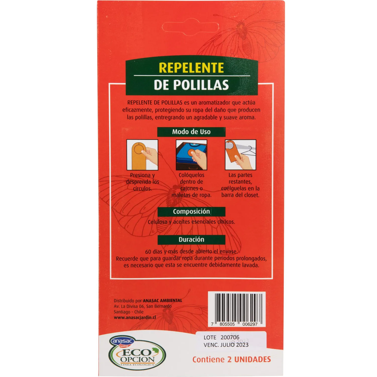 El Repelente de Polillas Eco Opción viene en un envase con 2 unidades. Su uso es ideal para el hogar, colocándose una banda por closet o despensa. Actúa eficazmente protegiendo tu ropa del daño que generan las polillas al alimentarse de las fibras de tus prendas. Su uso es simple y efectivo, asegurando una protección continua por 60 días desde que abres el envase.