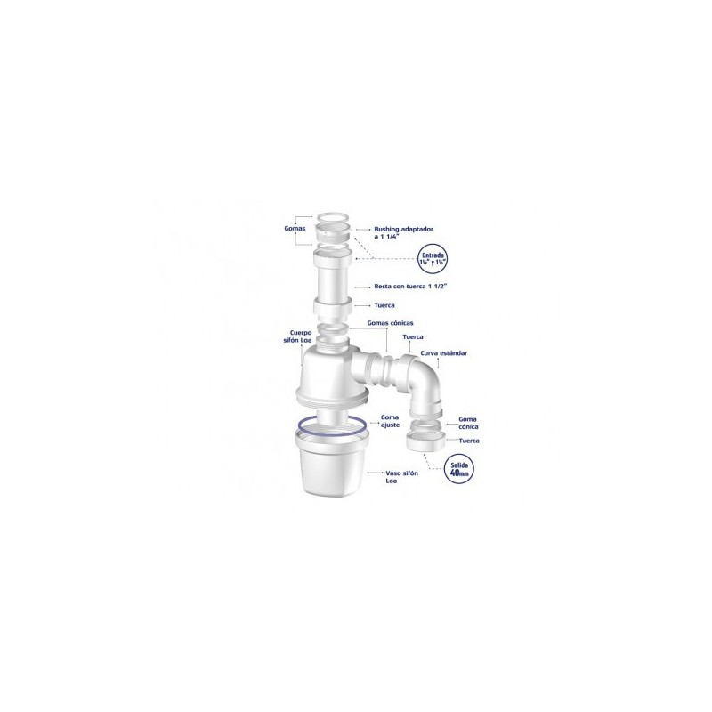 Modelo con Bushing adaptador para medidas 1 1/4″ y 1 1/2″ hilos de conexión universal, adaptable a todo tipo de desagües de lavaplatos.